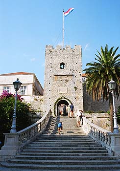 アドリア海沿岸航路で、ドゥブロブニクの一つヴェネチア側の町がコルチュラ島最大の町、コルチュラだ。町は元々島であったように見える小さな半島上にある港湾都市だ。中世のヴェネチア領時代に城壁と砦とで要塞化された現在の姿になった。