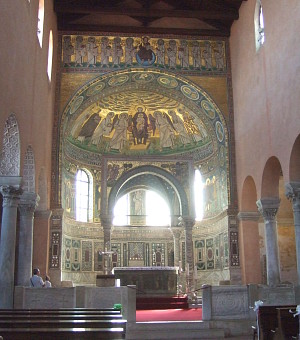 この6世紀の小さいながらも完全なエウフラジエヴァ・バジリカ(Eufrazijeva bazilika)は、太い黒木の梁が屋根を支える古代の聖堂プランが目を引く、イタリアのラヴェンナと並ぶ初期キリスト教時代の貴重な建造物である。