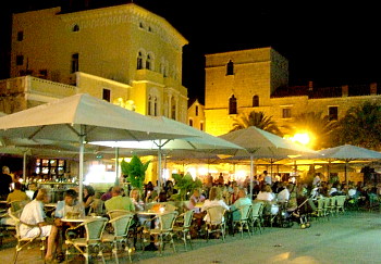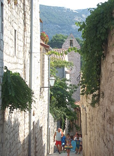 町には石畳の歩道が張り巡らされ、白っぽいダルマチアの石を使った建物がぎっしり立ち並ぶ。 岬の付け根に近い城壁跡に登れば、4本の塔がお互い近くに干渉しあって見事な調和を見せる。 |