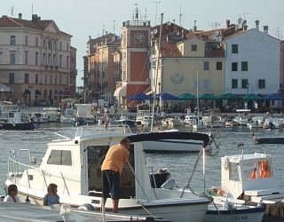 新港側から見ると、海岸は比較的急な斜面となって海に落ち込んでおり、波を被る形で防波堤を兼ねた海岸沿いのカラフルな住居群が北向きに並んでいる。海から直接出入りする玄関を持つこれらの家々は、運河沿いに入口を持つヴェネチアの家並みそのものだ。 一方旧港側からは、深く切れ込んだ良港を囲むように南向きの明るい家並みが港を囲み、海岸沿いに露店やカフェなどが数多く並ぶリゾート感のある一帯となっている。 いずれもまさに、クロアチアの海岸部を代表する絵のような風景と言ってよいだろう。 そしてこの両港を結ぶ埋め立て部分に街のメインストリートが形成されており、末端には、時計塔と旧市街への入口であるバルビ門とがある、巨大なチトー元帥広場(Trg Marala Tita)になっている。 |