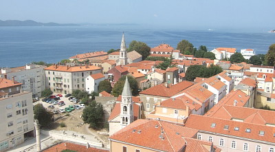 グリャン島の島影の静かなザダル海峡に面した小さな岬の上に、オレンジ色の瓦屋根の家々がギッシリひしめいている。かつてのイタリアの都市ザーラ(Zara)の旧市街だ。そして、現在のクロアチア第5の都市ザダルの見所は、この中に集中している。