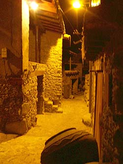 そんな新しい村に埋もれるように、300メートルほどの長さの歴史保存地区の旧街道が残されている。人がやっとすれ違うほどの石畳の道の両側は、二階のテラスが張り出した木の梁を持つ土壁とレンガの家屋が軒を連ねる。道端に座った老人がリンゴの皮をむいている。特産の果物のシロップ漬けを作っているのだろう。街道の一番下の大岩は、村名の由来となった「悪い石」(カコペトリア)だ。