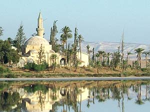 市内に入る前に、空港に近いラルナカ塩湖のほとりに建つモスク、ハラ・スルタン・テッケジ(Hala Sultan Tekkesi)【写真下】に寄ることが出来る。キリスト教国に位置するこのモスクは、イスラム教の創始者モハメッドの叔母が眠る674年に建立された由緒あるモスクで、イスラム世界でも重要なモスクの一つと考えられている。