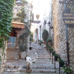 城壁に囲まれた楕円形の町には、城門をくぐって入る。3階立ての建物の間に狭い路地が張り巡らされているが、すっかり観光化されており、その多くが店舗やアトリエ、レストラン、カフェになっているので明るく、市場のようで歩いていて楽しい。高級リゾートに近いだけあって、どのショップも洗練されており、商品はものがよい。