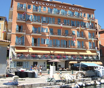 すぐその脇には、有名なオテル・ウェルカムがある。 海に面して立つ古いホテルのテラスからは、ちょうどプロムナードや漁港越しに湾内が一望できる、人気の高い由緒あるホテルだ。 サン・ピエール礼拝堂製作の時に、ジャン・コクトーが滞在したことで知られている。