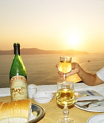 ブドウ色に染まる静かな水面に、多島海のように黒い島影が浮かび上がる。時おり横切る大型クルーズ船が、青白い光を放ちながら、色紙のような水面に一條の切り込みを描いていく。 崖沿いの通りから僅かに下った一帯は、レストラン、カフェ、タヴェルナが占領している。