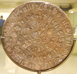 紀元前2000年期のクレタ島各地の美術品。粘土板には未解明の象形文字(文字の拡大写真はページ最下部)