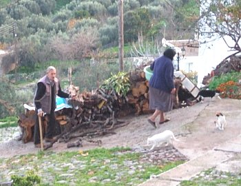 ブドウ畑の中に、細い路地に沿って白い家並みが並ぶ様は、典型的な美しいギリシアの村だ。表通りから一歩奥に入ると、田舎の暮らしが垣間見える[写真中]。