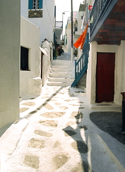 ミコノスの町は美しい。どこから見ても一枚の絵を切り取ったような光景の連続だ。山から眺めても、海から眺めても、また町の中を歩いても、素晴らしいショットが連続する。基本要素は、海と空の青、建物に塗りたくられた石灰の白、その白壁を飾る強い色彩の扉・窓枠・花の色、強い太陽の陽射し、迷路のような路地、草も疎らな白っぽい土。これらが組み合わさって、何万通りもの絵画を作り出している。