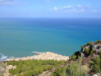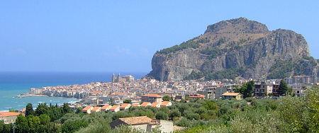 この一帯は海岸線にまで山が迫り、狭い海岸線に沿って高速、鉄道、国道が並行して走る風光明媚な地域だ。東西どちらから近づいても、まず海岸の巨岩「ロッカ」(La Rocca)に気がつくはずだ。特に西のパレルモ側からアクセスするときは、そのふもとのかわいい町を従えた絵のようなチェファルーの姿にまず心を奪われるに違いない。