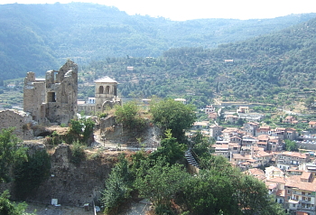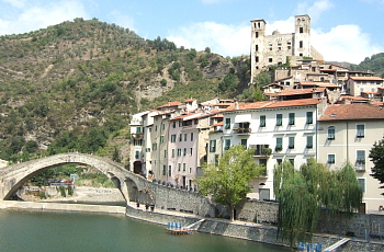 谷間のわずかな平地に開けた新市街から、中世の石橋を渡った対岸の急峻な山の斜面に作られているのが、ドルチェアクア旧市街だ。 「甘い水」を表す町の名に興味を引かれるが、起源を辿るとラテン語か、ケルト語の地名が訛って、そんな発音になったらしい。 現在の城は、13世紀に町を手に入れたジェノヴァのドリア家が建設したものだ。戦乱と地震で崩壊し一時は打ち捨てられたが、最近になって観光用に、一部修復されている。