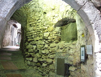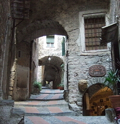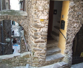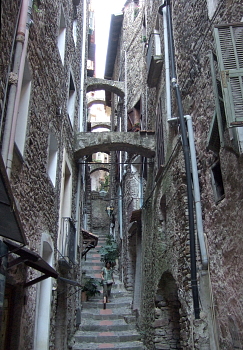山の中腹から川面にかけて、中世の古い家々が密集し、最上部には村を支配するかのように、お世辞にも優雅とは言えない砦のような城が、覆い被さっている。 歩道橋の階段を上るかのような傾斜のきつい太鼓橋を渡ると、いよいよ旧市街だ。 右手には、典型的なリグリア風の地区教会、サンタントニオ・アバテ教会があり、旧市街で唯一陽光に溢れる一角を作り出している。 |
