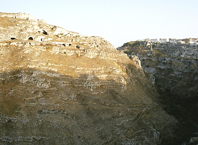 崖っ淵のプロムナードは、渓谷に張り出したサン・ピエトロ・カヴェオーゾ(S.Pietro Caveoso)教会で終わる。よく見ると、渓谷を挟んで目の前に迫る対岸の崖にも、同じような岩窟が多数見られる。