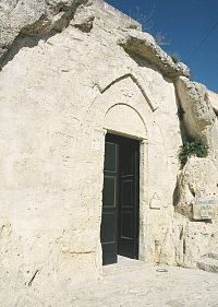 この先道は細くなるが崖に沿ってさらに進むと、有料で見学できる洞窟の家や、岩をくり貫い作られたサンタルチア・アッレ・マルヴェ(S.Lucia alle Malve)教会を初め、いくつかの洞窟教会跡がある。光があまり届かないためか、キリストやマリアをはじめ、聖人たちを描いたフレスコ画がまだ色鮮やかだ。