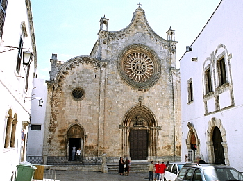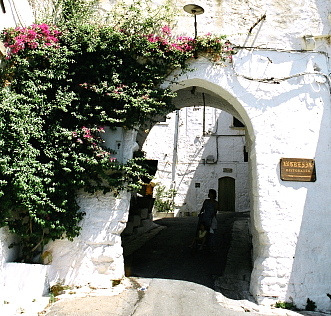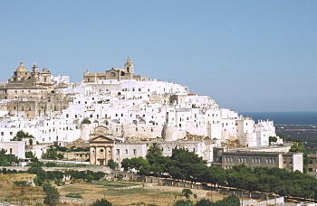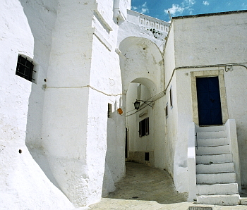 この先の旧市街は、崖となって平野部に落ち込んでいるため、この広場からが旧市街への一般的な入口となっている。車は入れないので徒歩で行こう。 旧市街は、直径300メートルほどの大きさで、丘の上のカテドラルを中心に斜面にまぶしいほどの白い家々が密集している。あまり観光化されてはいないとは言え、曲がりくねったヴィア・カテドラーレ(Via Cattedrale)を登っていくと、両側にはちらほら土産物屋やレストランなどが見られる。 道は、昔修道院であった時の呼び名に因みモナチェッレとも呼ばれる、サン・ヴィート・マルティーレ教会(Chiesa di San Vito Martire)のところで、大聖堂を見下ろす壁に突き当たる。 そのまま進まずにいったん戻り、反時計回りに等高線に沿ってとぐろを巻くように周回する路地に入って見ると面白い。