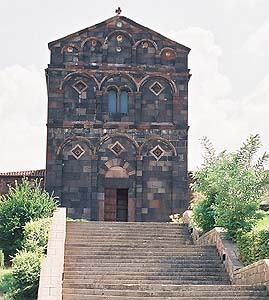 だがオッターナには2つの貴重な過去の遺産があるので立ち寄ってみたい。インターを降りて2分の新市街の中にポツンと立つのが、サン・ニコラ教会(San Nicola)[写真]だ。1150年ごろにピサ風のロマネスクスタイルで立てられており、黒、紫、白の石が組合された外観が見事だ。