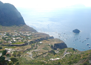 サリーナ島はミラノ、ローマ、どこから行くにしても不便なエオリエ諸島の離島だが、さらに港からバスで30分はかかる一番奥まったところにある、わずか20〜30戸の小さな村がポッラーラだ。標高962メートルのフォッサ・デッレ・フェルチ山(Monte Fossa delle Felci)から海に落ち込む急斜面の傾斜が緩んだ肩のような緑の窪地に静かに広がっている。峠越えのバスが、一気に海に向かって下っていくとき、その様子が手にとるようにわかる【写真上】。
