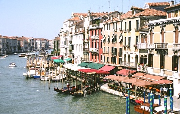 主要な建物は全て運河に面していて、運河側に正面玄関を持っているので、観光は水上からするのが正しい。時おり横切るヴァポレット(渡し舟)やゴンドラを眺めながら進んでいく。 ゲットー(ユダヤ人居住区)を過ぎて先へ進むに従い、重要な商館や邸宅が多くなりファザード(建物の正面)が豪華になっていくのが分かる。市場を過ぎるてすぐ潜るのがリアルト橋だ。