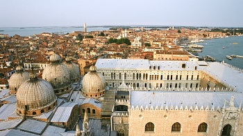 一方、左手奥の鐘楼は、最上部から海に浮かぶモザイクのような奇跡の街の眺めが楽しめる。L字型に曲がった奥の部分が、今や観光客に占拠されてしまったサンマルコ広場である。 |