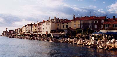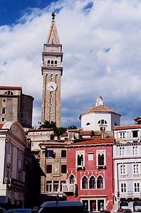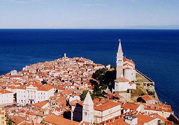 ![]() 旧 市街の背後には新市街が広がっており、山に向かって坂をあがっていくと突然、かなり保存状態のよい城壁の一部に出くわす。上に登ってみると聖ユリイ教会から灯台までの町の全景、さらにその背後にはかつての首都ヴェネチアの山影が望まれる。ピランを訪れたらぜひこの景色を眺めておきたい。