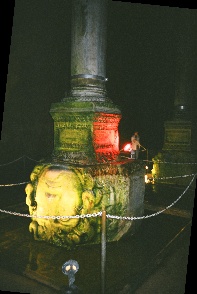 旧市街には、他にも史跡が数多く残されている。ローマ時代の道標の他、エジプト、ギリシアなど各地から運んできた歴史遺産も町中にさりげなく置かれている。地下に眠るYerebatan Sarayı[イェレバタン宮殿(地下宮殿)]も見ものだ。6世紀に市街地の地下に作られた大規模な貯水槽であり、それがそのままの姿で残されていることにも驚くが、構造を支える石柱とアーチが連続する様はまさに宮殿にようだ。中には異教徒の神殿の柱を転用した涙の柱や、柱の台座に使われている巨大なメドゥーサの首など、目を見張る造形が散りばめられている。