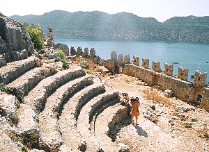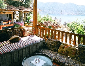 帰り道、眺めの良いカフェで、靴を脱いで絨毯を敷き詰めたテラスで寛ぐのも良い[写真5]。港の岩陰の海の中に、リキアの石棺が一つ浮かんでいる[写真6]。度重なる地震で地盤沈下して土台が海中に沈んでしまったものであろう。ぜひ対岸のケコヴァ島まで足を伸ばして水中遺跡を探勝してみたい。