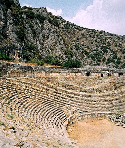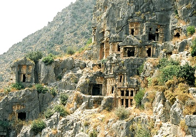 代都市ミラ(Myra)は、現在のカレ市街から2キロの森の中にある。ミラは現在のトルコ南部で栄えたリキアの主要都市の一つで、紀元前5世紀頃に出来たと考えられており、紀元2世紀頃には独自の通貨を持つ大きな町に発展していた。アクロポリスは高い断崖の上に有り、その麓の平野部との境目に、有名なネクロポリス(死者の町、すなわち墓地)と劇場がある。断崖の随所に岩を切り出して掘られた、人がすむにはやや小さめなサイズの家々は、リキアの文化・技術水準の高さと都市の力を物語っている[写真4]。アレキサンダー大王に随行し、インドなど東方に石の加工技術を伝えたと言われているのも頷ける気がする。