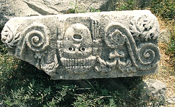 そのひとつひとつの石の切り口や彫刻は、文化財といえるレベルのもので、それらが無造作に散乱している様子にこの地域の奥深さが感じられる[写真7]。現代の観光客も踏んで通る入口の敷石には、はっきりとギリシア文字が刻まれていた[写真6]。