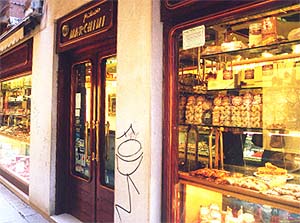 ン・マルコ広場から西にサン・ステファノ教会へと向かう小道の途中、どこにでもあるような小さなサン・マウリツィオ運河を渡る橋のすぐ向こう右側に小さな菓子店があります。磨き上げられたウィンドウを飾る焼菓子にチョコレート、キャンディー、そしてお客の絶えない店内。