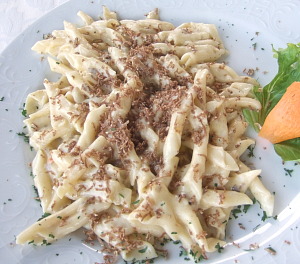 元の食材から作られる料理は、すべて山のものだ。前菜には、地元のプルシュト(プロシュート─生ハム)、羊のチーズ、またさすがこの地の特産だけのことはあり、チーズのトリュフ掛けという贅沢なメニューもある。