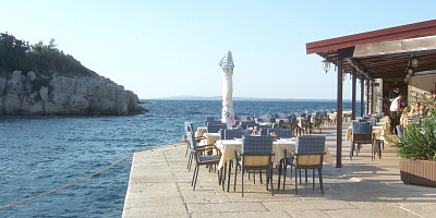 わいらしいヴェリ・ロシーニの港の海辺に沿って、幾つものレストランが水際にテーブルを並べている。