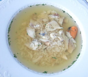 続いて運ばれた魚のスープは、白身魚と貝のだしがよく効いた雑炊風の一皿だ。 この付近ではイタリアのようにパスタやパンではなく、スープに米を入れることが多い。それが恰も、魚の雑炊のような親しみやすい味を引き出しており、最後の一滴までおいしくいただける。