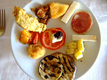行き着いたところは緑に覆われた農家のようなところ。余りの人の気配のなさに、閉店では、と心配になるが、木々の合い間を進んでいくと十数卓のセッティングされたテーブルが並ぶテラス席が見えてくる。山の中腹にまで登った位置にあるので、青い海岸線の景色が美しい。この素晴らしいテラスは、レストランの名前の由来でもある「テットイア」(大きな庇・張り出し屋根)で覆われた風通しの良い空間だ。 奥をのぞいてみると、かすかに物音がする。誰かいるようだ。ゆっくりと出てきた老人に食事ができるか聞いて見ると、大丈夫とのこと。ようやくここで食事ができることが確認でき、安心した。しかしここは、スローフードガイドを始め、数々のガイドブックに名を連ねる名の通った店なのだ。一家で切り盛りするこの店の料理は、決してグルメではないが、シチリアの海の幸、山の幸を活かした、まさしく料理自慢のマンマの味だ。シチリアのレストランを食べ歩いた人であれば、ここの料理がいかにお決まりのレストラン風メニューに毒されていない、貴重な手作りのレシピであるかを感じられるだろう。 |