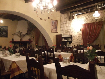 玄関の分厚い木の扉を開くと、室内は漆喰の白壁で、床には平たい石が敷き詰められている。田舎風の木製のベッドや調度品が、民族調のタペストリーと共に温かみをかもし出す。 初めて来たのに、懐かしい場所に帰ってきたような、ほっとした気分になる。 |