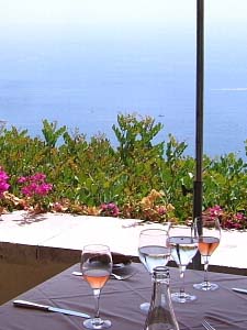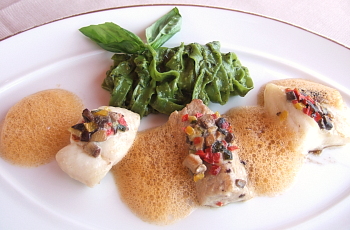 メインの魚料理は、懐石料理のように美しい、ミシュラン二つ星のメインレストランと同レベルの一皿だ。3種類の魚の小さな切身を軽くあぶって色鮮やかなラタトゥイユ風のソースを乗せ、さっぱりとした濃い味のムース(魚系のソースか?)を横に添えてお好みに応じて添えられるようにしている。付け合せは緑の手打ちパスタのジェノバ風。見て楽しみ、頭で楽しみ、口で楽しむ、この一皿は。テラスの素晴らしさに引けを取らない。