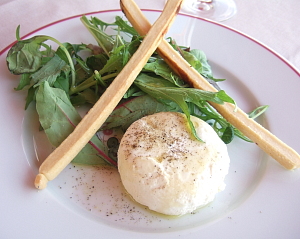 続いて出されるチーズは、それ自体、料理と思えるほどの立派な皿だ。オリーブオイルとコショウを振ったヤギのチーズ(シェーブル)はコクと酸味のバランスが何とも言えず素晴らしく、直径数センチ、厚み3センチほどの分量がある。添えられたチーズの効いたグリッシーニと、グリーンサラダは見た目も味も美しい。