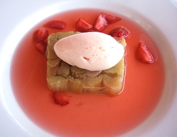 薄黄緑の野菜(アスパラガス?)のゼリー寄せのテリーヌを、イチゴを散らした赤くて甘いストロベリーソースで囲み、イチゴのソルベが乗せられている。