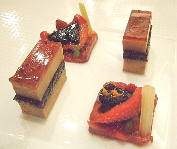 一つは、ケーキに見立てた料理で、スポンジ代わりの野菜か何かのペーストでジャム系の濃い味のペーストをサンドし、さらに上部にストロベリーゼリーを重ねた、菓子のような美しい品だ。