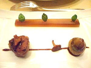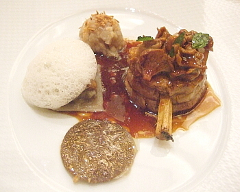 付け合せの一皿目は、抽象画のような美しいものだった。棒状のコンソメゼリーに揚げたミントか何かの葉を3枚あしらったものを背景に、米、野菜、キノコなどから作った2つの小品をソースの線で結び、アクセントに小さなシメジを配したものだ。