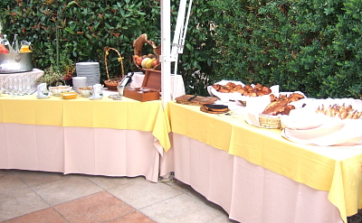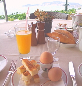 スイートなら海の見えるルームテラスでの食事も良いが、そうでもなければ昼食と同じ絶景のテラスでの食事がよい。 外来客がいない静かなテラスは、朝の涼しさも相まって、昼とは違った雰囲気だ。 ランチの時は肩身の狭そうだったのに今や自分の庭のように自由に歩いているホテルの飼い猫と遊んだり、手持ちぶさたなスタッフとのんびり会話したり、一番アットホームな食事タイムといえるかも知れない。