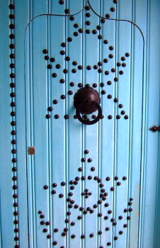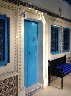 チュニジア風の装飾が見事な水色の立派な木戸をくぐった、建物の中をくり貫いたトンネル状の部分が受付になっている。そこを抜けると目の前は石を敷き詰めた長方形の中庭だ。 四辺には、中庭を見下ろすように2層に宿の各部屋のドアが配置されている。街の喧騒からは想像できない静かな落ち着いたスペースだ。毎朝、夏のまだ涼しい時間に、ブーゲンビリアの花に囲まれたオープンエアのこの場所で取る朝食は気持ちいい。