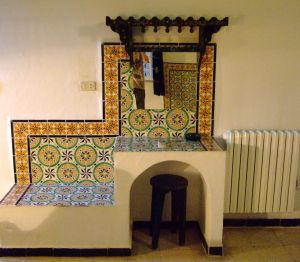 室入口に面した四角い廊下は、美しいチュニジアンタイルで飾られており、修道院の中庭の眺めを思い起こさせるような光景だ。水色のドアを開いて、その昔、商人たちが泊まったであろう一室に踏み入れる。