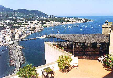 泉の湧く保養地として名高いイスキア島。その200mほど脇の海上に寄り添って浮かぶ岩山の山頂に、当時ギリシア人領であったシチリア島のシラクーザのゲローネ(Gerone)1世によって紀元前474年初めて要塞が建設された。1438年、アラゴン朝のアルフォンソ5世は要塞を再建し、島を橋で繋いだ。 |