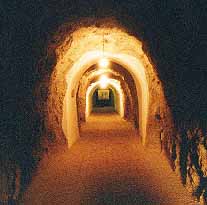 スキア・ポンテの町はずれ、アラゴン橋の袂で車を降りる。一直線にアラゴン城まで伸びる橋を渡りきると入場門があり、そこから裸電球が灯る真っ暗な小さいトンネルがまっすぐ伸びている。気をつけて進んでいくと、その先にはエレベーターの乗り場があり、いきなり山頂に出ることができる。ホテルはすぐそこだ。 |