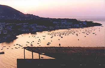 室は、クララ女子修道会修道院であった建物を利用したシンプルな作りで、決して広くはない。しかしテラスからの眺めは何ものにも代えがたい。一直線に伸びるアラゴン橋とその向こうのイスキア・ポンテの町。夕景けに染まる海に漁港に点在する漁船。左手には、今はホールとなっているインマコラータ教会の聖堂。