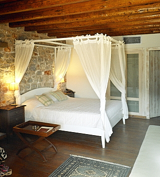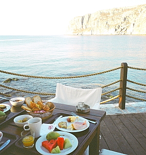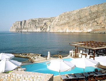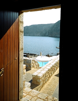 セプションの建物を海側に突き抜けて進むと、再び目も眩む陽光の下だ。海に面した石のテラスには真っ青なプール、その回りを囲む、塔有り、離れ有りの複雑な建築群の一つ一つが、個性的な客室になっている。このホテルでは、どの部屋を選ぶかが特に重要だ。料金区分だけでも8つ、さらにそれぞれの立地により楽しみ方が違ってくる。