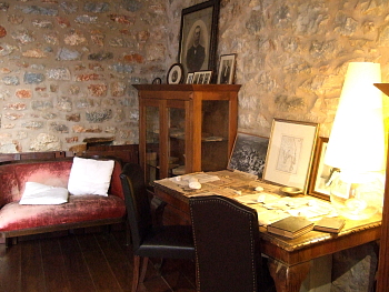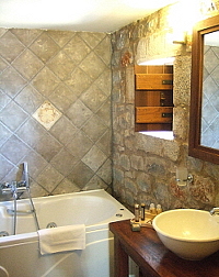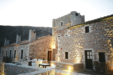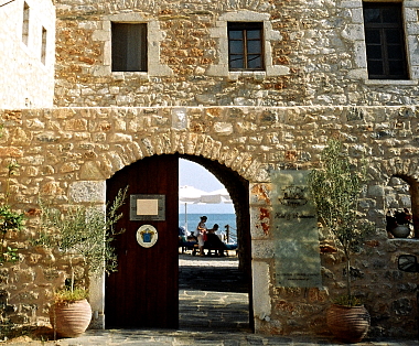 石壁のゲートを抜けた後、陽射しを白一色の石材が反射する白い光の世界から、一転して暗やみの中に通される。初めは回りの様子が全くわからないが、目が慣れてくると古びてはいるが落ち着いたレセプションであることが分かる。この一角には、大邸宅のようなロビーと、倉庫をそのまま使っているであろう画廊がある。マーニ特有の乾燥した大地の村々を描いたプリント画なら、手軽に入手できる。 |