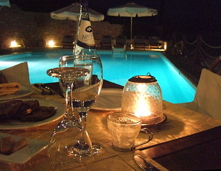 布が敷かれた大きな木製のガーデンテーブルに、ゆったりした木綿地の椅子、キャンドルに輝く、磨かれた食器やワイングラスの光が幻想的だ。あたりはほの暗く、微風と柔らかな並みの音、ゲストたちの低い会話の声が、心地よい。