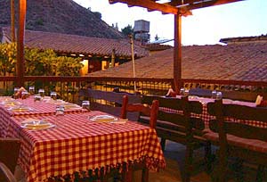泊まるならぜひスイートをお勧めする。ドアを開けると立派なシステムキッチンを備えた落ち着いた食堂、そして次がクラシックなインテリアのリビング、さらにベッドルームは天蓋つきの素敵なベッドとアンティークの箪笥、衣装箱がある。しかし一番のくつろぎの場所はなんと言ってもロッキングチェアと木のテーブルがある広いテラスだ。古い瓦屋根の町並みや山々の眺めが美しい。何があるわけではないが、のんびりした空気とアンティーク家具に囲まれ、それでいて設備がしっかり整っている贅沢な時間を過ごすことが出来る。
