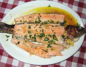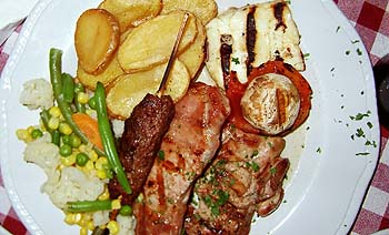 料理は、肉なら素朴なミックスグリルの盛り合わせが美味しい。豚、鶏、羊などの肉を串刺しにして炭火焼きしたものをいただく。ブロック肉はアツアツでジューシー、また羊の挽肉のケバブはさっぱりして美味しい。魚なら、この店のお勧めは川マスのグリルだ。淡白な肉をパセリとニンニクのソースでバランスがよくいただく。 デザートはホームメイドのアップルパイがおいしい。甘さ控えめでしっとりしていて、お菓子というより料理のようだ。添えられたアイスクリームの甘味が良くマッチする。